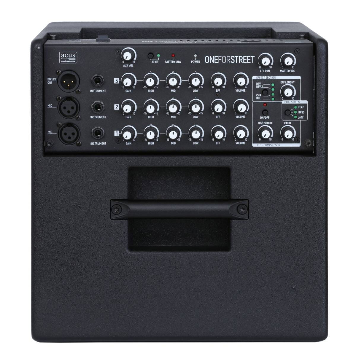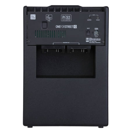 - Dodatkowe funkcje: ONEFORSTREET 10 to 120-watowy wzmacniacz dla małych zespołów, wyposażony w 3 niezależne wejścia (kanały 1 i 2: wejście mikrofonowe lub instrumentalne, kanał 3: wejście instrumentalne) oraz wejście Aux (możliwość podłączenia za pomocą stereofonicznego gniazda jack 3,5 mm lub Bluetooth Acus Artesia BT-1) z niezależną regulacją głośności. Wszystkie 3 wejścia posiadają regulację Gain, 3-pasmowy EQ, efekt send oraz Volume.