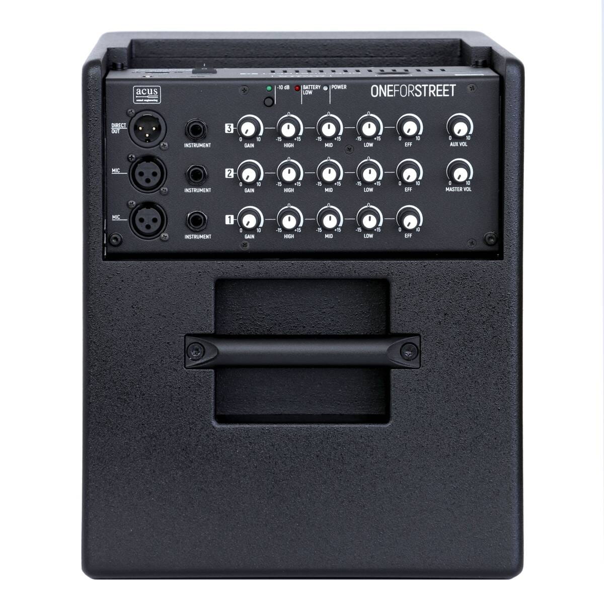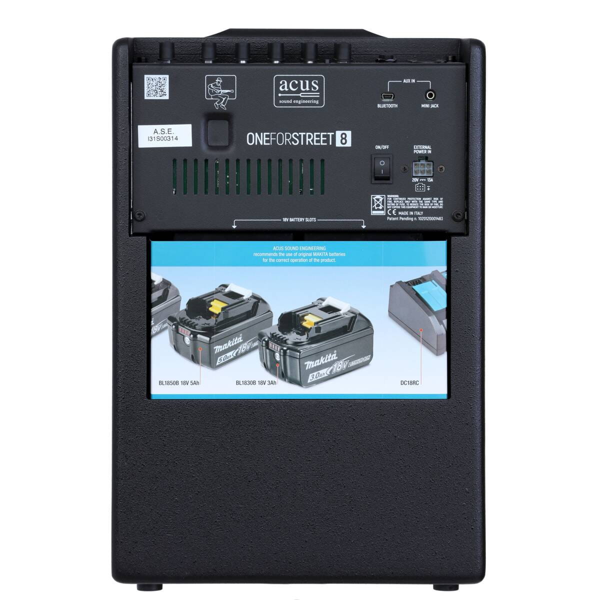 - Dodatkowe funkcje: ONEFORSTREET 8 to 90-watowy wzmacniacz do gitar akustycznych i klasycznych, wyposażony w 2 niezależne wejścia (kanał 1: wejście mikrofonowe lub instrumentalne, kanał 2: wejście instrumentalne) oraz wejście Aux (które można podłączyć za pomocą stereofonicznego gniazda jack 3,5 mm lub Bluetooth Acus Artesia BT-1), każde z niezależną regulacją głośności. Oba wejścia wyposażono w kontrolę Gain/Volume, 3-pasmowy EQ oraz efekt send. System posiada wbudowany efekt typu Reverb, kontrolę Master Volume, zbalansowane wyjście Direct Out (wyposażone w przełącznik tłumienia, oznaczony jako "-10 dB", umożliwiający dostosowanie poziomu wyjścia Direct Out do wejścia mikrofonowego) oraz wskaźnik naładowania baterii LED (aktywny tylko podczas pracy na baterii). Wejście mikrofonowe jest wyposażone w zawsze aktywne zasilanie phantom.