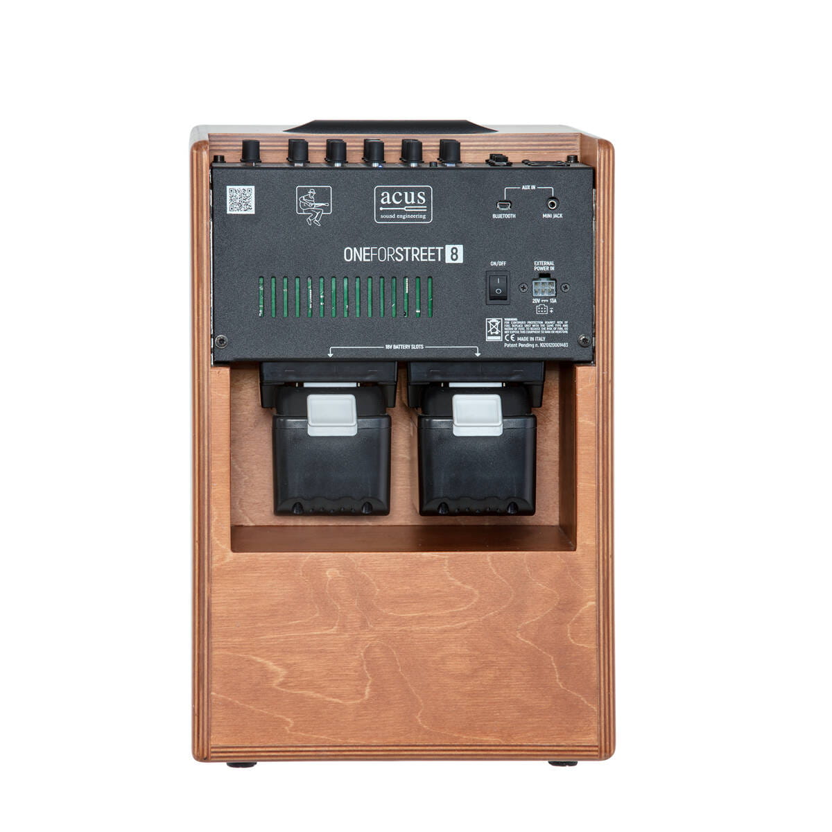 - Dodatkowe funkcje: ONEFORSTREET 8 to 90-watowy wzmacniacz do gitar akustycznych i klasycznych, wyposażony w 2 niezależne wejścia (kanał 1: wejście mikrofonowe lub instrumentalne, kanał 2: wejście instrumentalne) oraz wejście Aux (które można podłączyć za pomocą stereofonicznego gniazda jack 3,5 mm lub Bluetooth Acus Artesia BT-1), każde z niezależną regulacją głośności. Oba wejścia wyposażono w kontrolę Gain/Volume, 3-pasmowy EQ oraz efekt send. System posiada wbudowany efekt typu Reverb, kontrolę Master Volume, zbalansowane wyjście Direct Out (wyposażone w przełącznik tłumienia, oznaczony jako "-10 dB", umożliwiający dostosowanie poziomu wyjścia Direct Out do wejścia mikrofonowego) oraz wskaźnik naładowania baterii LED (aktywny tylko podczas pracy na baterii). Wejście mikrofonowe jest wyposażone w zawsze aktywne zasilanie phantom.