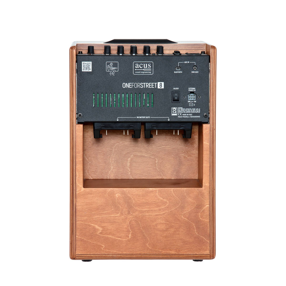 ACUS ONEFORSTREET 8 WOOD to przenośny wzmacniacz do instrumentów akustycznych o mocy 90 W RMS, idealny idealny dla muzyków ulicznych często grających bez możliwości podłączenia do prądu.