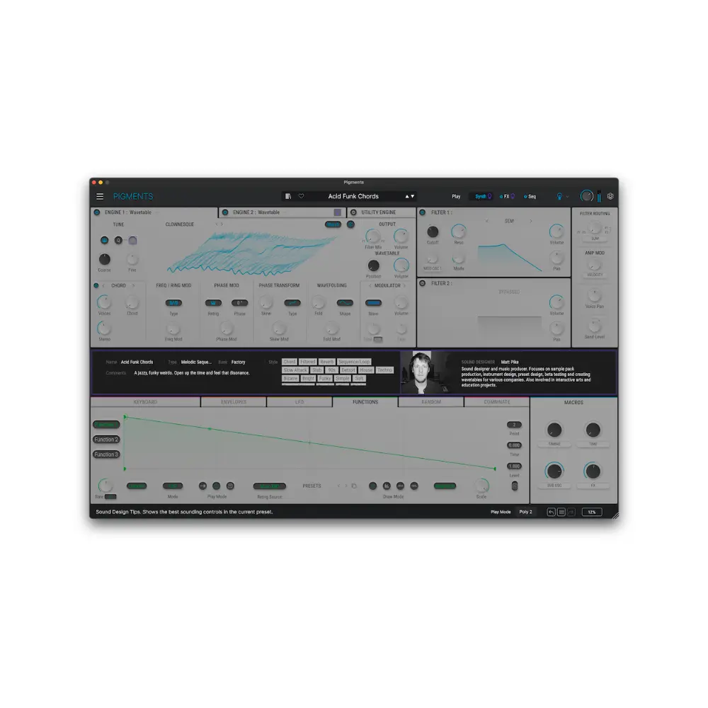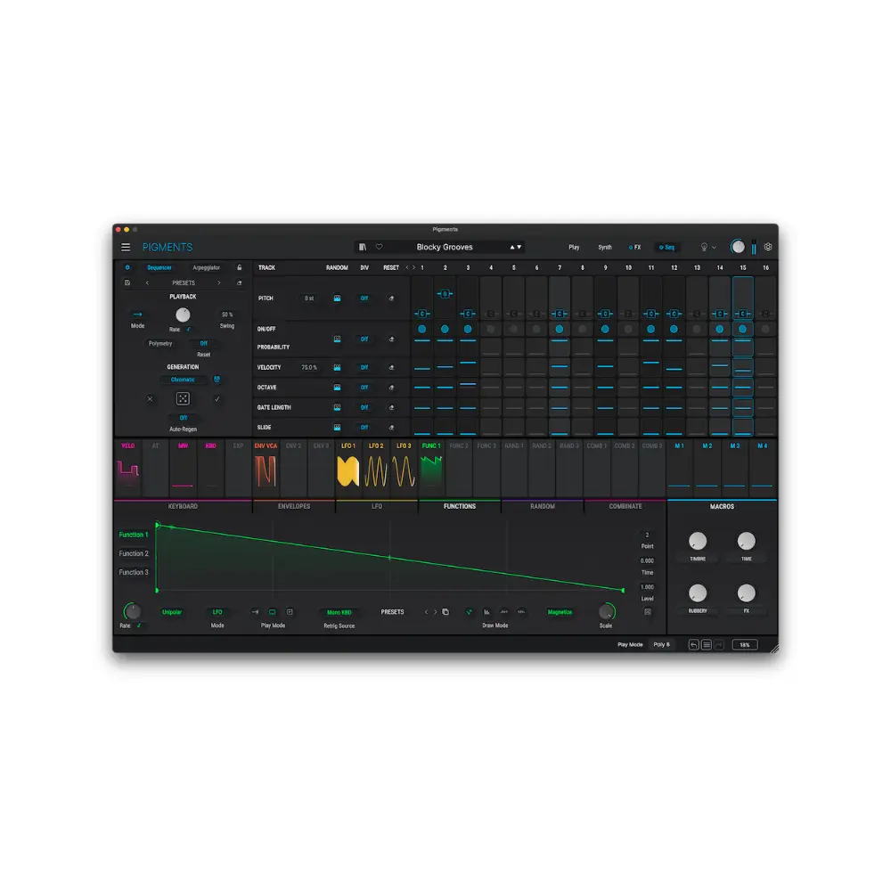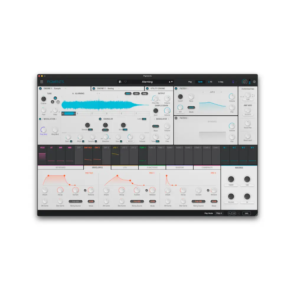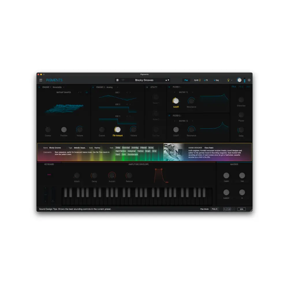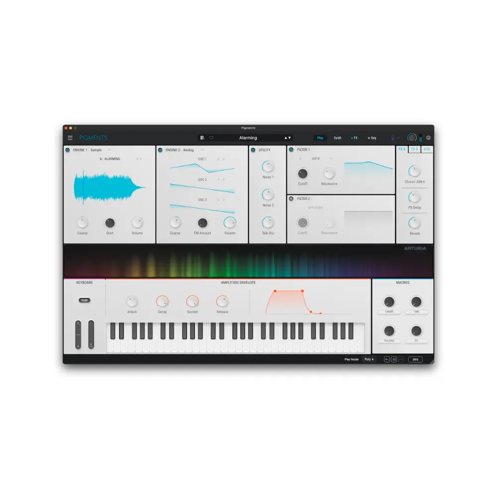 Pigments to wszechstronny wirtualny syntezator dla nowoczesnych producentów, łączący 6 najnowocześniejszych silników syntezy, kolorowy interfejs, łatwą modulację typu „przeciągnij i upuść”, najwyższej jakości efekty i zaawansowane sekwencjonowanie. Kształtuj swoją wizję dźwiękową – od gotowych do miksu presetów po głęboki, niestandardowy sound design.