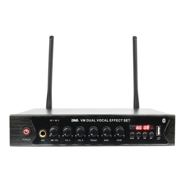 DNA VM DUAL VOCAL EFFECT SET to wysokiej jakości bezprzewodowy system mikrofonowy oparty na technologii cyfrowej. Zestaw składa się z dwóch bezprzewodowych mikrofonów oraz niewielkiego, kompaktowego odbiornika FM z portem USB i wbudowanym odtwarzaczem plików audio, regulowanym efektem pogłosu oraz obsługą Bluetooth. Idealnie sprawdza się jako nagłośnienie dla zespołu weselnego, firm eventowych, animatorów gier i zabaw, zestaw mikrofonów do karaoke, a także dla różnego typu instytucji kulturalnych i oświatowych.