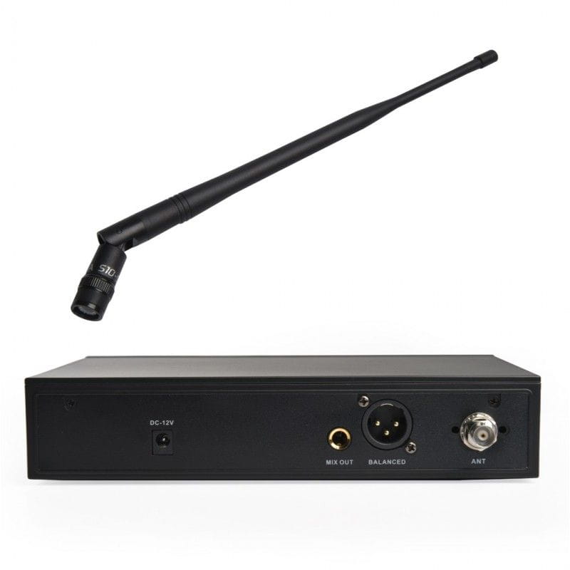 Drugą część systemu stanowi odbiornik fal radiowych o zakresie częstotliwości od 518 do 542 MHz. Na tylnej części jego obudowy znajduje się wyjście XLR, wyjście typu jack (1/4”), gniazdo zasilacza oraz złącze antenowe BNC. W części przedniej mieści się przełącznik zasilania, potencjometr głośności, odbiornik podczerwieni oraz panel sterowania z wyświetlaczem LCD. Pokazuje on aktualne parametry systemu, takie jak poziom sygnału RF/AF, ustawienie częstotliwości odbiornika, wybrany kanał pracy, a także to, czy mikrofon jest aktualnie włączony, czy wyłączony. Korzystając z przycisków Up, Down i Set możemy dokonać ręcznego wyboru częstotliwości lub przeprowadzić autoskan, podczas którego do urządzeń systemowych automatyczne przypisana zostanie niezakłócona częstotliwość.