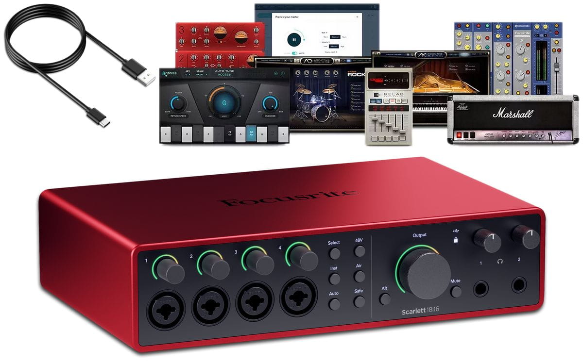 Focusrite Scarlett 18i16, wiodący w branży interfejs audio USB dla producentów, z konwerterami zaczerpniętymi z flagowej serii RedNet firmy Focusrite. 18i16 oferuje 18 wejść i 16 wyjść, w tym cztery przedwzmacniacze mikrofonowe, wejścia Hi-Z i liniowe, łączność ADAT, SPDIF i MIDI.