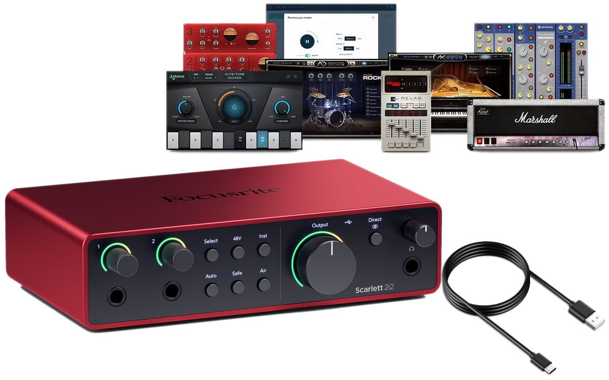 Focusrite Scarlett 2i2 4th gen ułatwia uzyskanie lepszych nagrań za każdym razem. Dwa najbardziej szczegółowe, niskoszumowe przedwzmacniacze mikrofonowe Focusrite z 69 dB wzmocnieniem, najwyższej klasy konwertery z ogromnym zakresem dynamiki 120 dB oraz kompletnie nowe funkcje Auto Gain i Clip Safe pozwolą na to, że każde nagranie będzie łatwe, szybkie i godne uwagi. Dodatkowo przeprojektowany tryb Air pozwoli na dodanie analogowego sznytu do Twoich utworów. Kompletny zestaw narzędzi obejmujący programy Pro Tools Artist, Ableton Live Lite i pakiet oprogramowania Hitmaker Expansion, w którym znajdziesz m.in. Auto-Tune Access do wokalu, Softube Marshall Silver Jubilee 2555 do gitar, syntezator Native Instruments MASSIVE i wiele innych, pozwolą żeby tworzyć bez przeszkód. A kiedy już stworzysz utwór, to na dowolnych słuchawkach uzyskasz doskonały dźwięk, dzięki wzmocnionym wyjściu słuchawkowym 2i2 z niezależną regulacją głośności. Do tego spersonalizowany Easy Start i 5 letnia gwarancja sprawiają, że Twój Scarlett 2i2 będzie gotowy zawsze, gdy go potrzebujesz.