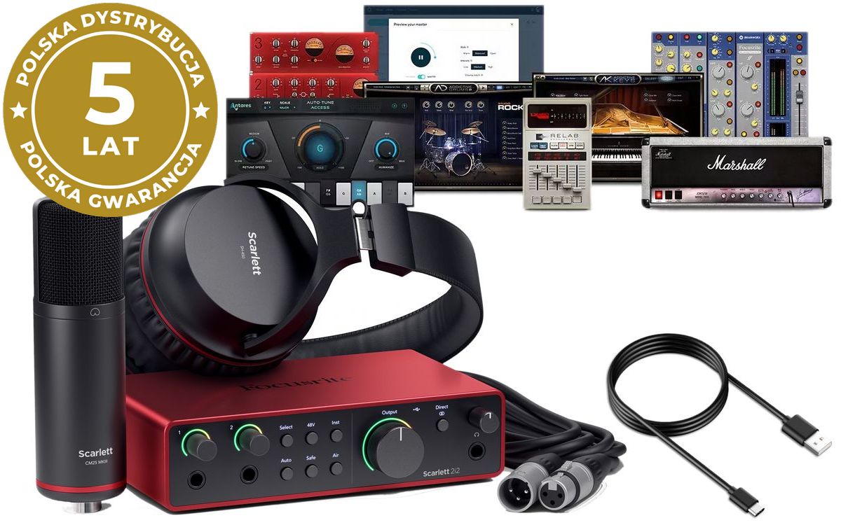 Focusrite Scarlett 2i2 Studio 4th gen zapewnia wszystko, czego potrzebujesz, aby uzyskać lepsze nagrania za każdym razem. Dwa najbardziej szczegółowe, niskoszumowe przedwzmacniacze mikrofonowe Focusrite z 69 dB wzmocnieniem, najwyższej klasy konwertery z ogromnym zakresem dynamiki 120 dB oraz kompletnie nowe funkcje Auto Gain i Clip Safe pozwolą na to, że każde nagranie będzie łatwe, szybkie i godne uwagi. Dodatkowo przeprojektowany tryb Air pozwoli na dodanie analogowego sznytu do Twoich utworów. Kompletny zestaw narzędzi obejmujący programy Pro Tools Artist, Ableton Live Lite i pakiet oprogramowania Hitmaker Expansion, w którym znajdziesz m.in. Auto-Tune Access do wokalu, Softube Marshall Silver Jubilee 2555 do gitar i wiele innych. Do tego szczegółowy studyjny mikrofon pojemnościowy z pop filtrem, kablem XLR i wygodne, precyzyjne słuchawki zapewniają doskonały dźwięk od razu po podłączeniu. Spersonalizowany Easy Start i 5 letnia gwarancja sprawiają, że Twój Scarlett 2i2 Studio będzie gotowy zawsze, gdy go potrzebujesz.