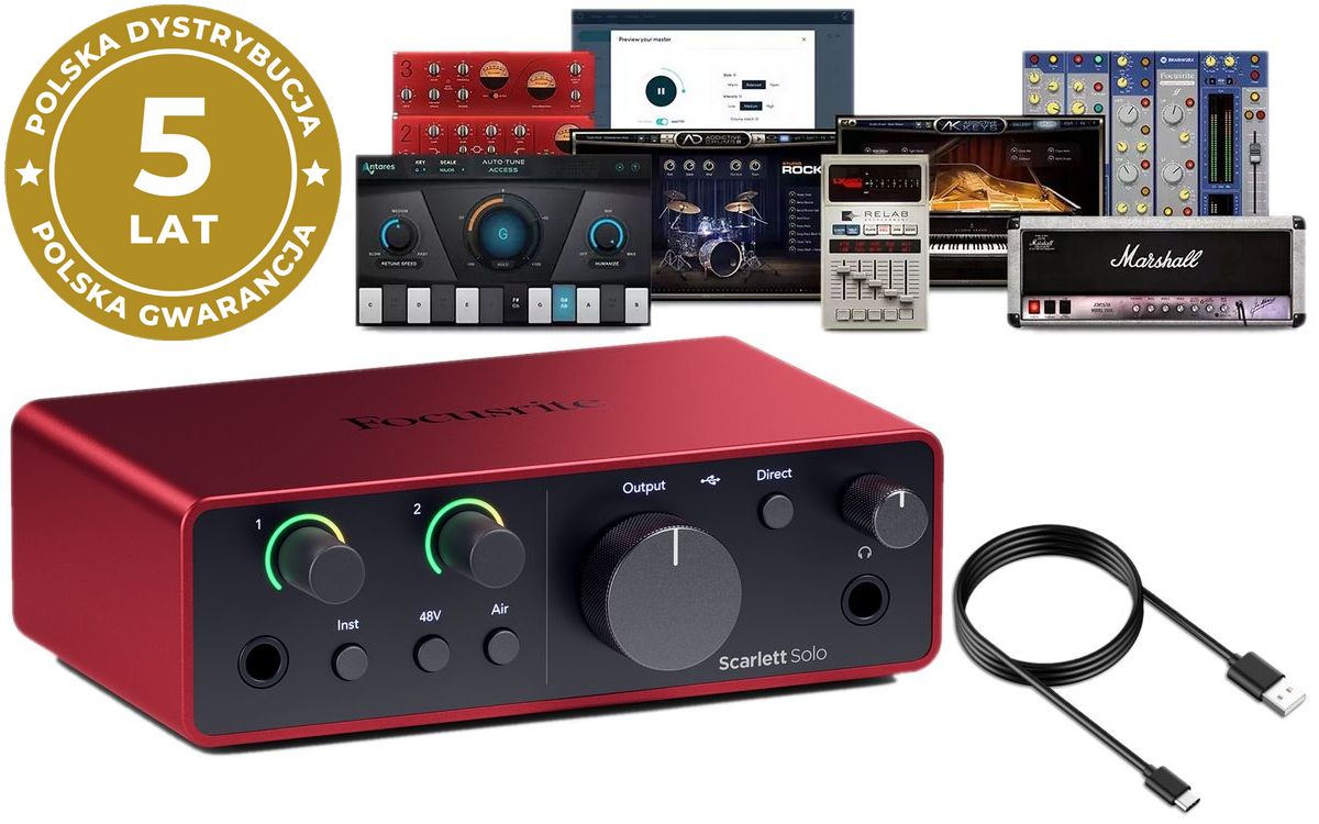 Focusrite Scarlett Solo 4th gen sprawia, że nagrywanie i wydawanie utworów nigdy nie było łatwiejsze. Bardzo szczegółowy, niskoszumny przedwzmacniacz mikrofonowy Focusrite najwyższej klasy konwertery z ogromnym zakresem dynamiki 120 dB oraz przeprojektowany tryb Air pozwolą na to, że każde nagranie będzie brzmiało jak z najlepszego studia. Kompletny zestaw narzędzi do nagrywania utworów zawiera Pro Tools Artist, Ableton Live Lite i pakiet oprogramowania Hitmaker Expansion, w tym Auto-Tune Access i Sonnox VoxDoubler dla wokalu, Softube Marshall Silver Jubilee 2555 dla gitary, syntezator Native Instruments MASSIVE i wiele innych, które pozwolą żeby tworzyć bez przeszkód. A kiedy już stworzysz utwór, to na dowolnych słuchawkach uzyskasz doskonały dźwięk, dzięki wzmocnionym wyjściu słuchawkowemu z niezależną regulacją głośności. Do tego spersonalizowany Easy Start i 5 letnia gwarancja sprawiają, że Twój Scarlett Solo będzie gotowy zawsze, gdy go potrzebujesz.