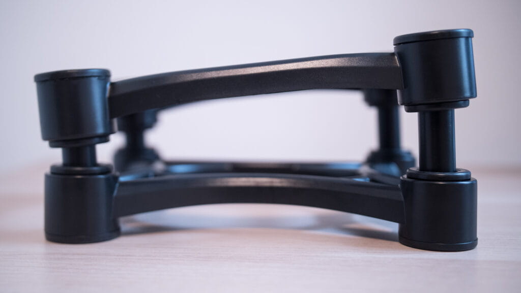 Ważnym aspektem konstrukcji standu jest możliwość regulacji wysokości i kąta nachylenia głośnika. Dzięki temu można optymalizować jego położenie względem słuchacza i wyeliminować odbicia fal dźwiękowych od powierzchni nośnej. W typowej konfiguracji Desktop Audio Workstation (DAW), słuchacz znajduje się w odległości od 1 do 1,5 metra od monitorów, a jego uszy około 50 cm nad powierzchnią roboczą. Dlatego też odpowiednią wysokość i kąt nachylenia monitorów można osiągnąć właśnie za pomocą izolatorów IsoAcoustics.