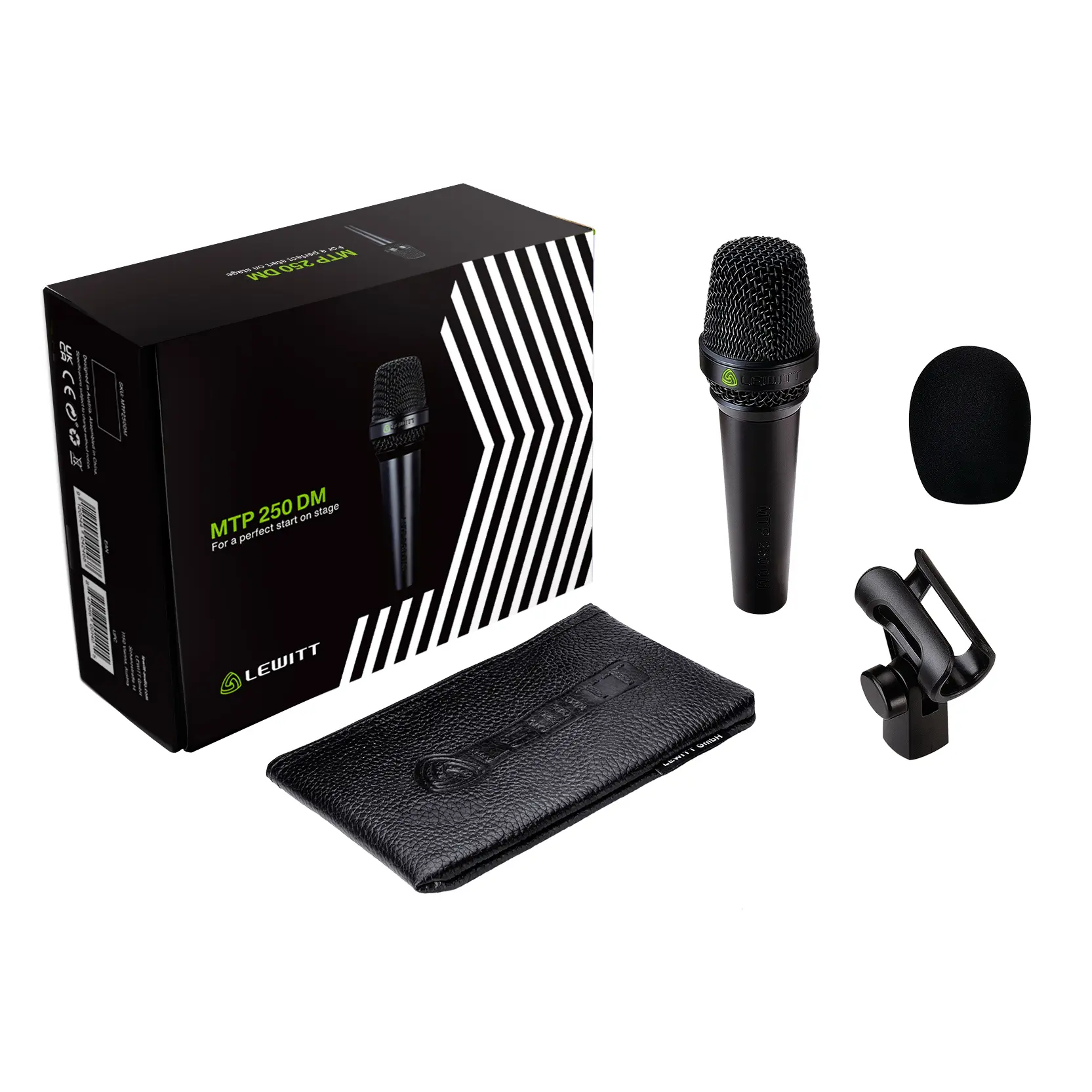 MTP 250 DM zawiera uchwyt mikrofonowy typu snap-in, osłonę przeciwwietrzną oraz etui.