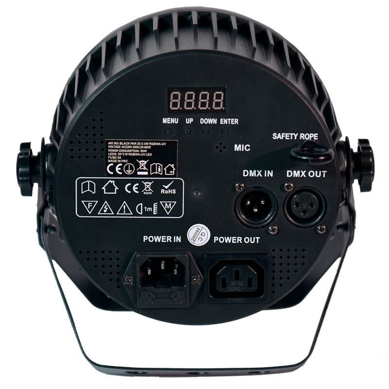 LIGHT4ME BLACK PAR 30x3W RGBA-UV to jeden z najprostszych w obsłudze i najtańszych reflektorów typu LED Par w ofercie sklepu muzycznego Music Express. Urządzenie wyposażone zostało w 30 diod LED o mocy 3 watów każda. Operują one światłem w palecie kolorów RGBA (red, green, blue, amber), a także ultrafioletowym (UV). Barwa biała powstaje dzięki mieszaniu kolorów podstawowych. Wśród funkcji urządzenia znajdziemy m.in. możliwość naświetlania stałym kolorem, skokową, stopniową lub pulsacyjną zmianę barwy światła, a także tryb stroboskopu z regulacją częstotliwości błysków.