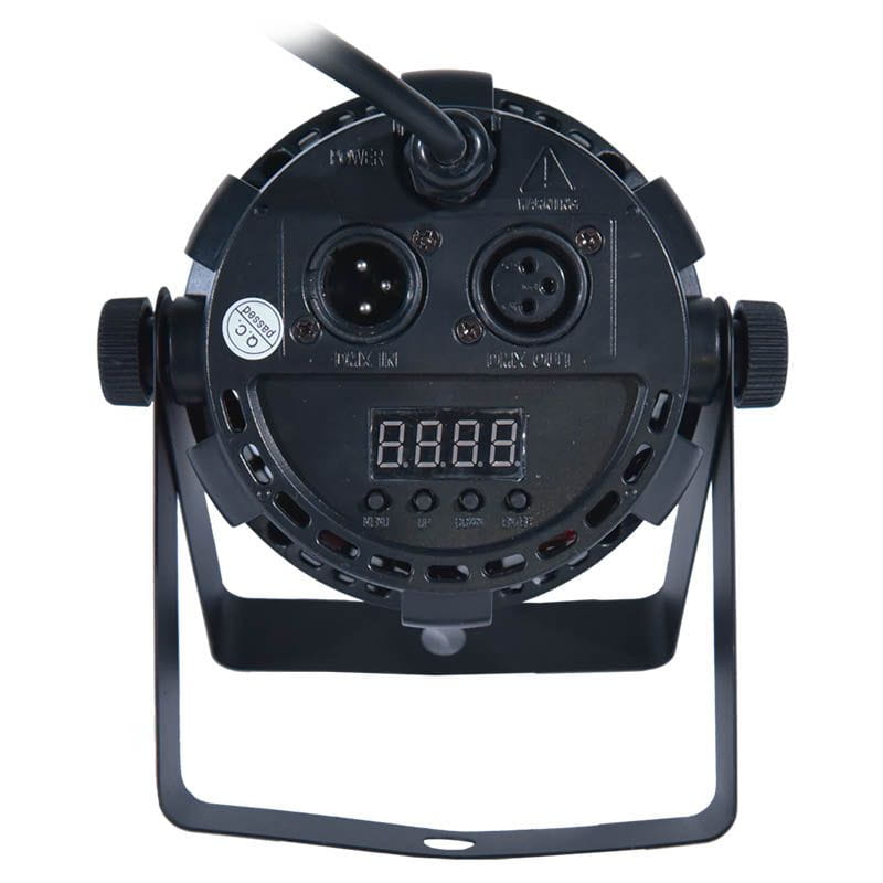 W części tylnej korpusu zainstalowany jest przewód zasilania, gniazda DMX (in/out) oraz intuicyjny panel sterowania w postaci wyświetlacza LED i czterech przycisków. Dzięki nim możemy wybrać jeden z kilku trybów pracy urządzenia: