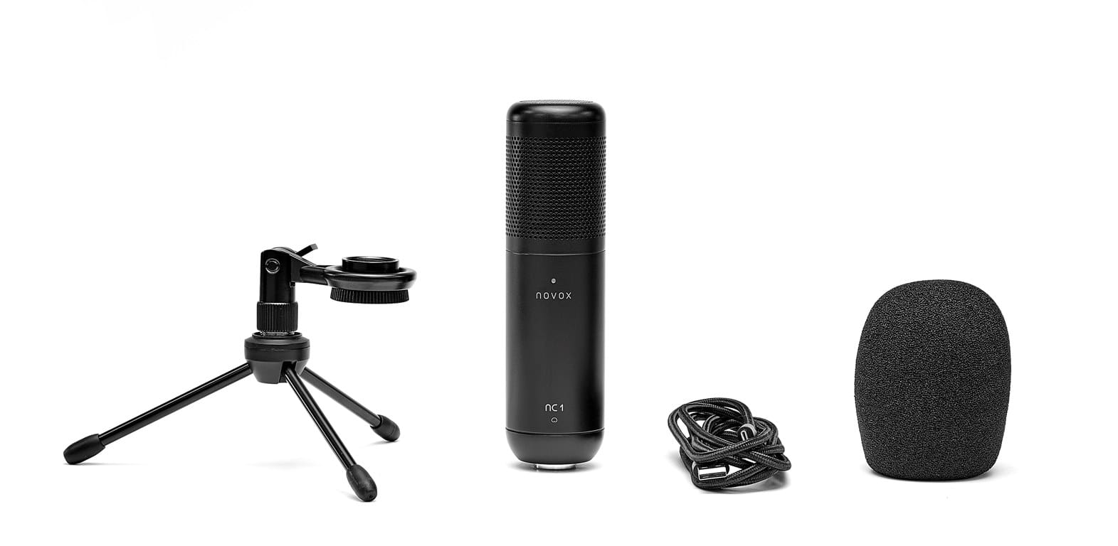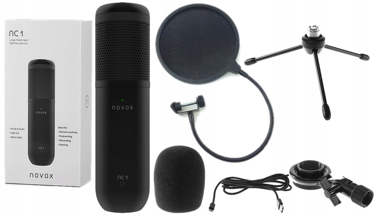 - w pudełku: mikrofon Novox NC1, kabel USB, statyw tripod, osłona przeciwwietrzna gąbka)