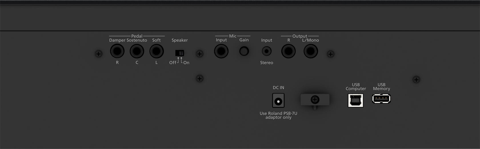 - 3 wejścia na pedały (Damper, Sostenuto, Soft): jack 6,3mm