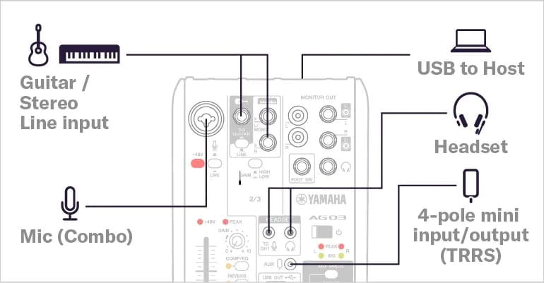 Oprócz wejścia mikrofonowego dla wybranego mikrofonu pojemnościowego, AG03MK2 posiada również wejście jack 1/4 cala do podłączenia gitary lub instrumentu liniowego oraz ulepszone 4-biegunowe gniazdo mini jack (TRRS) do wejścia i wyjścia smartfona .