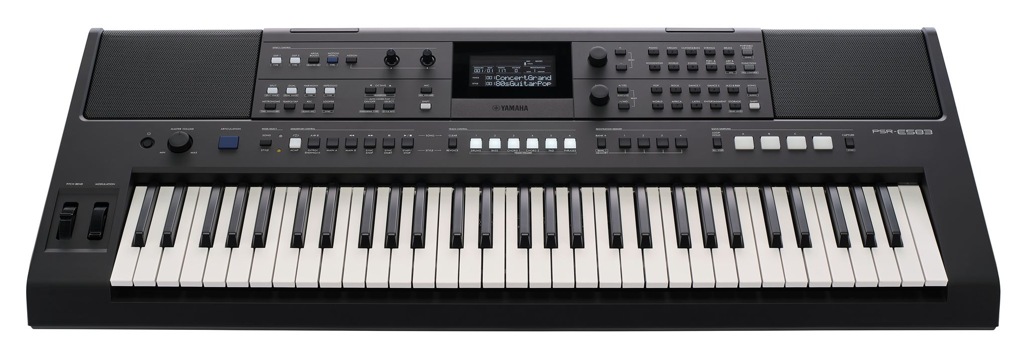 Model PSR-E583 oferuje dodatkowo drugie kółko modulacji, możliwość podłączenia pedału oraz mocniejszy system głośników, zapewniając jeszcze więcej możliwości podczas występów na żywo