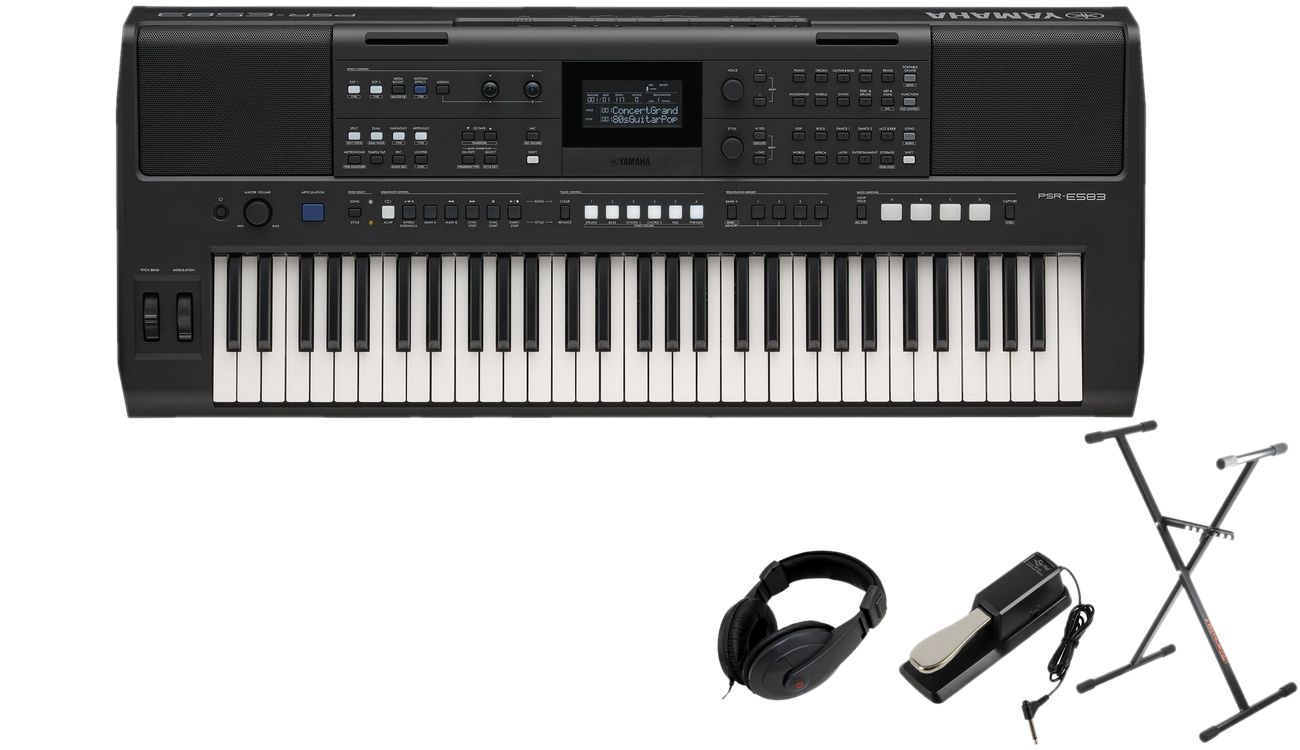 Model PSR-E583 oferuje dodatkowo drugie kółko modulacji, możliwość podłączenia pedału oraz mocniejszy system głośników, zapewniając jeszcze więcej możliwości podczas występów na żywo